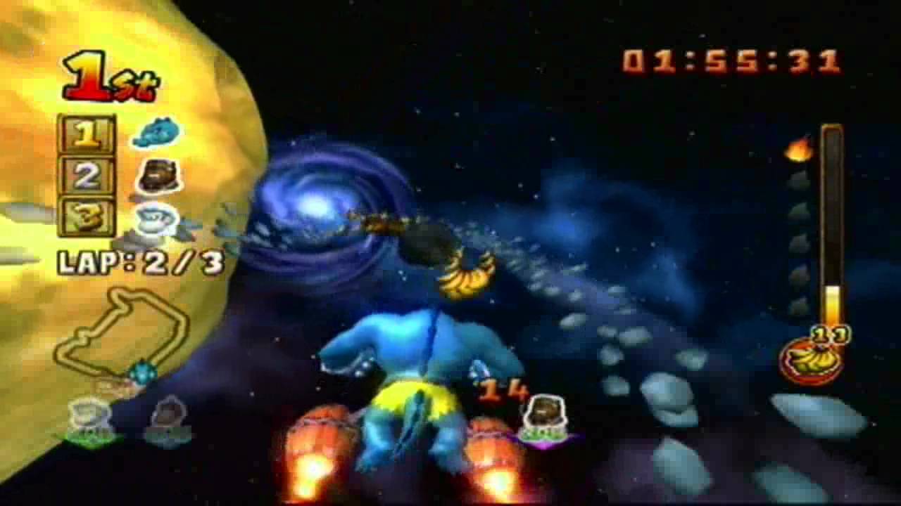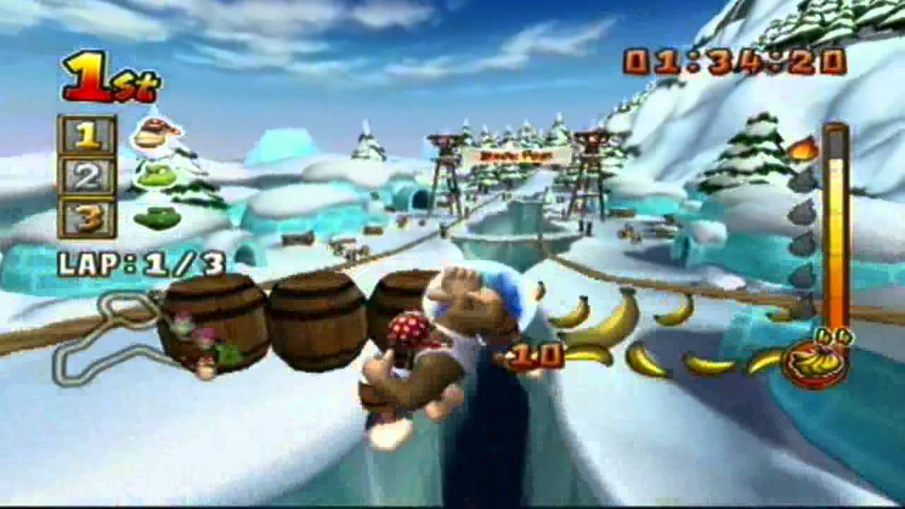 Fin dalla sua prima apparizione nei panni dell’avversario di un baffuto falegname di nome Jumpman, divenuto in seguito il famoso idraulico italiano Mario, Donkey Kong è diventato nel corso degli anni ’80 un’icona dei videogame. Donkey Kong è un enorme e forzuto gorilla che vive nella giungla e, come tutti i gorilla, va pazzo per le banane. Il suo segno caratteristico è un’enorme cravatta rossa con la scritta Donkey Kong. L’enorme gorilla tocca l’apice del suo successo con la trilogia sviluppata da Rare per Super Nintendo; Donkey Kong Country. Da allora questo personaggio ha fatto la sua apparizione in numerosi titoli dedicati a Mario (Mario Kart e Mario Party per citarne qualcuno) e in altri titoli da protagonista: Donkey Kong Jungle Beat e Diddy Kong Racing. Il titolo che abbiamo fra le mani, Donkey Kong: Jet Race (conosciuto in America con il titolo Donkey Kong: Barrel Blast) è un progetto, nato inizialmente per GameCube, che avrebbe dovuto sfruttare le esclusive periferiche a forma di bongo nate per la serie di giochi musicali Donkey Konga e Donkey Kong Jungle Beat. I controller raffigurano i classici barili di Donkey Kong e possiedono al loro interno, un microfono che permette di riconoscere il battito delle mani e le percussioni in entrambe i lati. Nintendo ha deciso di far slittare il gioco sino all’uscita della sua nuova console, abbandonando così il suo rilascio su GameCube.