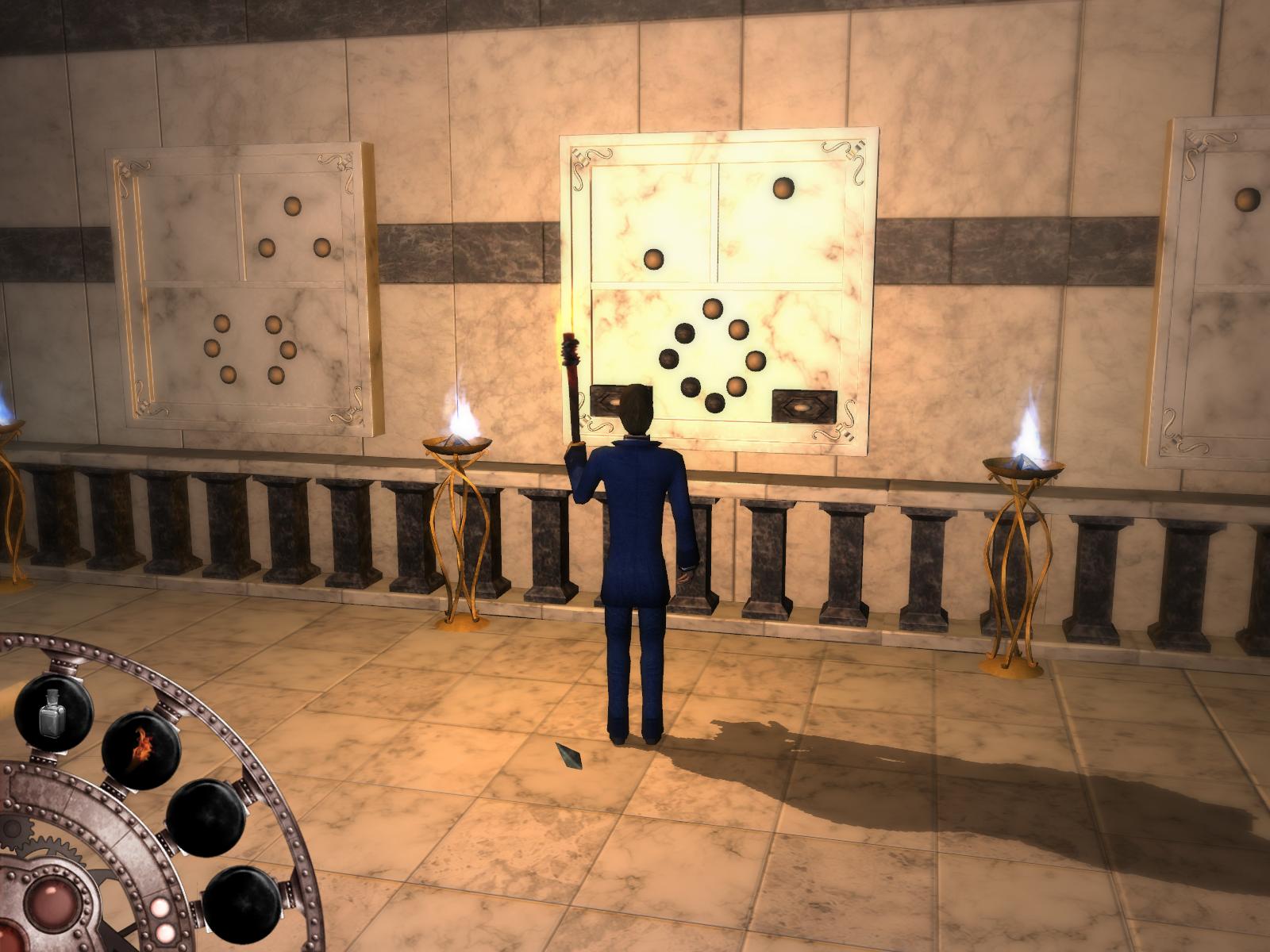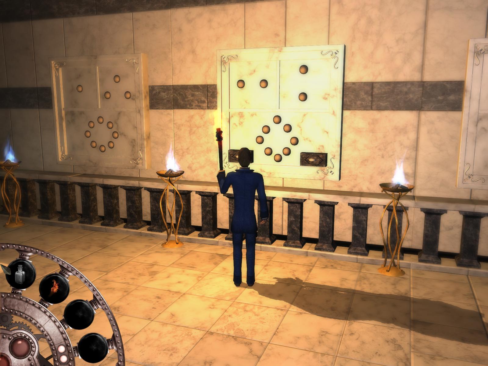 Entra nel corridoio e metti la statuetta di Atena nello scompartimento a sinistra della porta chiusa per accedere all’area segreta. Trovi davanti Atena con lo scudo, che secondo la mitologia, essendo realizzato in vetro servì a Perseo per sconfiggere Medusa. A destra e a sinistra della statua trovi tre pannelli, e solo quelli al centro posso essere modificati. Risolvere l’enigma è semplicissimo: mettiti di fronte alla statua e vai al pannello di sinistra, premendo sempre il tasto a destra per “colorare” tutte figurine sferiche.