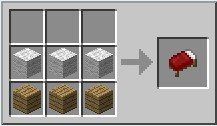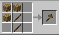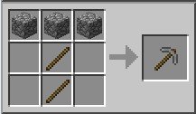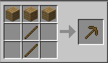 Gli strumenti che produrremo hanno tutti un manico fatto di bastoni, e un’altra parte di un materiale che per il momento è legno. Disponiamo due bastoni in verticale e tre assi di legno in cima per fare un piccone (vedi figura), e sempre due bastoni e tre assi di legno in angolo per fare un’ascia. L’ascia ci permetterà di procurarci più velocemente il legno, mentre il piccone ci permetterà di scavare la roccia.