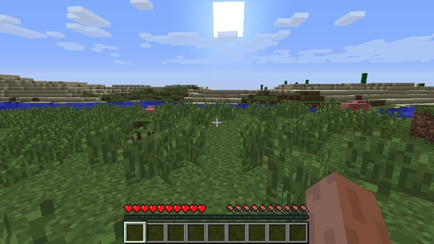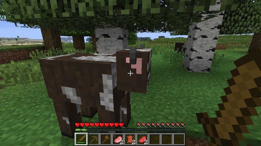 Nelle condizioni iniziali la cosa più probabile è che non abbiamo né grano (che impiega qualche giorno a crescere) né tantomeno cocomeri, e in genere i funghi marroni crescono in zone differenti dai funghi rossi. Quindi l’unica cosa da fare è prendere la nostra spada e uccidere una mucca, un maiale o una gallina. Una volta raccolta la carne ricordiamoci di cucinarla, mettendola nella fornace: otterremo della carne cotta, che sazia di più. Inoltre la carne di pollo non cotta (Raw Chicken Meat) può avvelenarci, facendo diminuire la salute per 30 secondi. Quindi: carne sempre ben cotta!