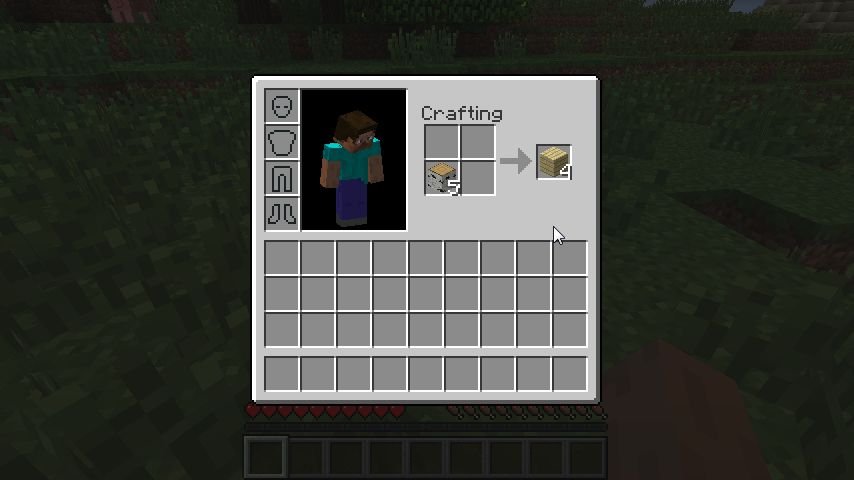 La prima cosa che ci occorre è il legno (Wood): guardiamoci intorno, cerchiamo uno o più alberi e scaviamone a mani nude la corteccia (se scaviamo tutto il tronco fino in cima, le foglie inizieranno a scomparire e potranno cadere mele (buone come cibo) e germogli (utili per piantare alberi in una zona dove mancano)). Una volta raccolta la legna apriamo l’inventario e trasciniamo la legna in un punto qualunque dell’area Crafting: verranno prodotte assi di legno (Wood Planks). Ogni pezzo di legno produrrà quattro assi.