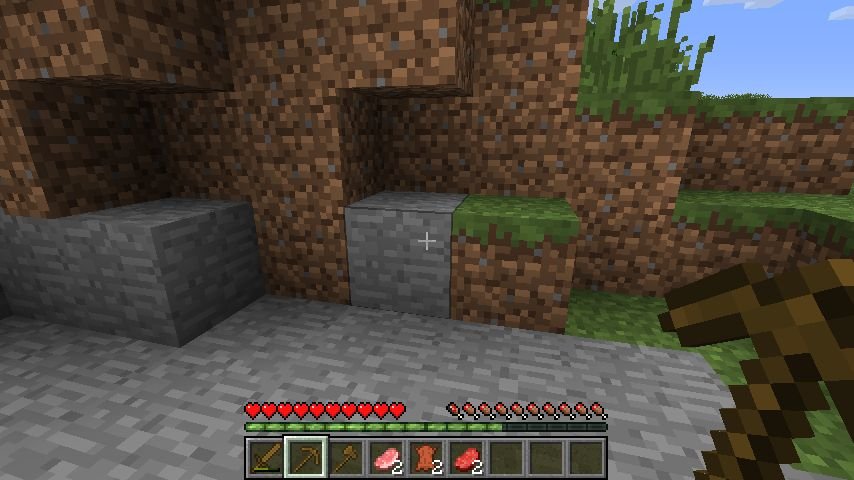 Per la prima notte dovremo accontentarci di scavare un riparo sotterraneo o quasi. Cerchiamo una collina o una montagna e iniziamo a scavarne il fianco fino ad avere un riparo sulla testa; possiamo usare le mani nude sul terriccio e il piccone sulla roccia. Saremo in una specie di corridoio, adesso voltiamoci e chiudiamo l’apertura con terriccio o pietre, magari lasciando una “finestrella” di un blocco se non vogliamo restare completamente al buio: i mobs ostili ci vedranno ma non potranno raggiungerci .