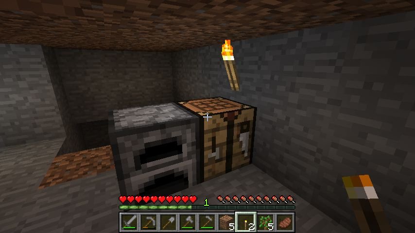 Se fuori è ancora notte (avete ricordato di lasciare una finestrella vero?) possiamo scavare un po’ nella nostra casa temporanea e raccogliere qualche pietra e (se li troviamo) del carbone o del ferro. Le pietre ci potranno servire per costruire una casetta non scavata nella roccia, oppure per fare un’ascia di pietra e velocizzare la raccolta di legna.
