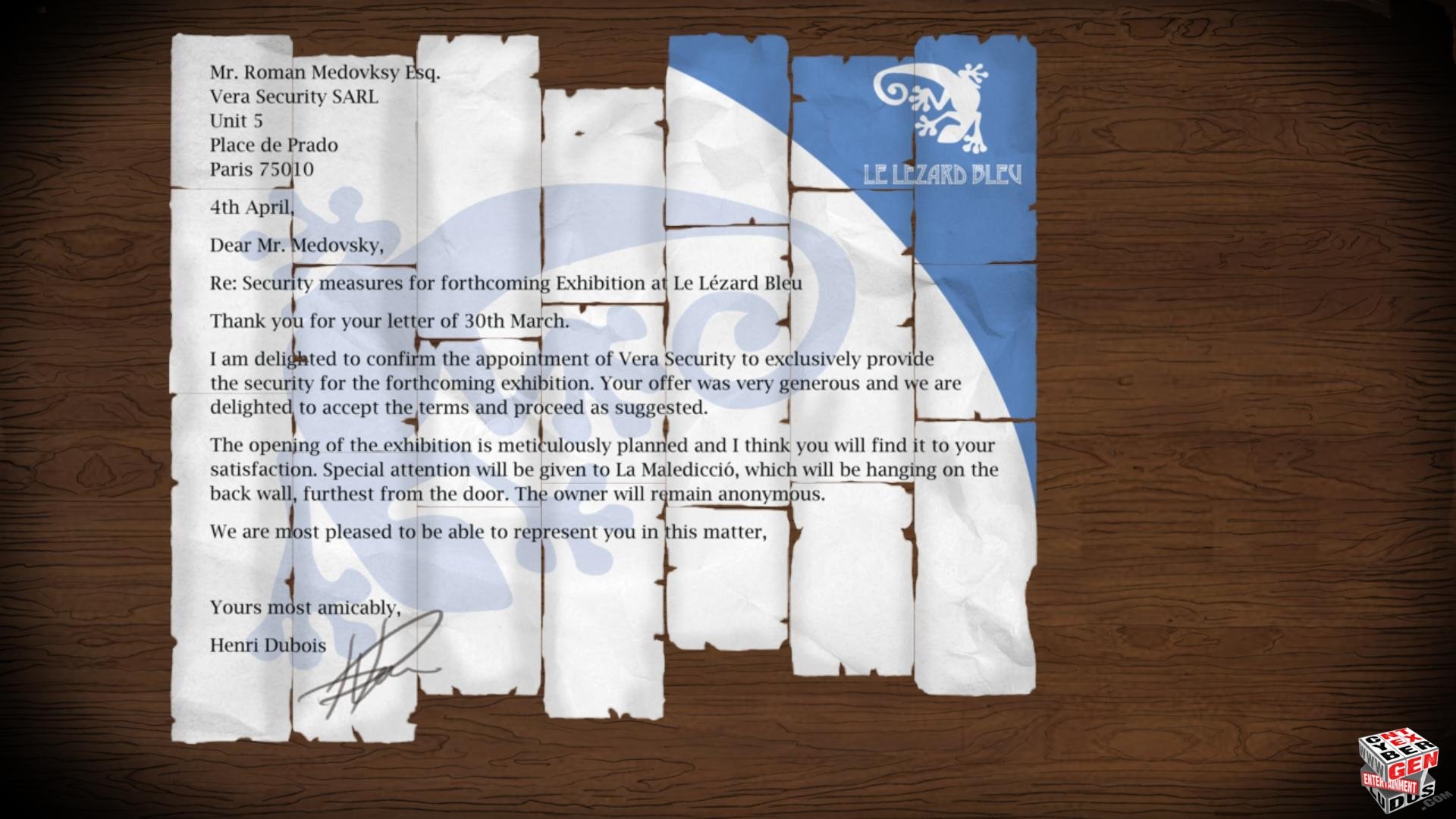 Dopo la scenetta otterrai il controllo di Nicole. Parla con Moue e col cameriere del bar: il problema è entrare nella galleria, e il cameriere è troppo scontroso con Nicole. Fagli vedere il pass per la stampa e cambierà idea, quindi potrai finalmente sostenere un dialogo come si deve. Esaurendo le opzioni riuscirai prima a bere una tazzina di caffè e poi ad averne uno d’asporto. Porgi il caffè a Moue e riuscirai ad entrare nella galleria. Parlando con George, anche Nicole verrà a conoscenza che l’Ispettore Navet sta rallentando la ricerca di prove, perciò dovrai distrarlo. Parla con l’Ispettore, Laine e il sacerdote: l’unica cosa che ti tornerà utile è l’interesse di Laine verso le prove organiche. Prendi il cartone della pizza e scoprirai una macchia di salsa, quindi interagisci con la stessa per spalmarla; per togliere la gomma, usa il pass. Completata l’opera, torna a parlare con Laine ed informalo della macchia, distraendolo da George. Otterrai nuovamente il controllo del protagonista. Dopo la chiamata, interagisci con la scrivania, apri il primo cassetto e tira fuori il fascicolo di Vera Security, l’agenzia di sicurezza che ha contattato Henry. Fruga nel cestino (è accanto alla scrivania sul lato sinistro, non si acchiappa bene l’hotspot) e leggi la lettera, poi prova ad interagire col sistema di sorveglianza ma serve una password a quattro cifre. Esci dallo zoom ed analizza il calendario: il compleanno di Henry era il 27 maggio, ovvero 27-05. Al primo fotogramma utile, osserva il quadro per sbloccare l’achievement Una coda, gnam!. Osserva tutti i fotogrammi e in particolare quello che mette il ladro in primo piano, in modo da scorgere la scritta “Waterloo Motors” sul casco. Esci dalla schermata di zoom ed entrerà Navet.
