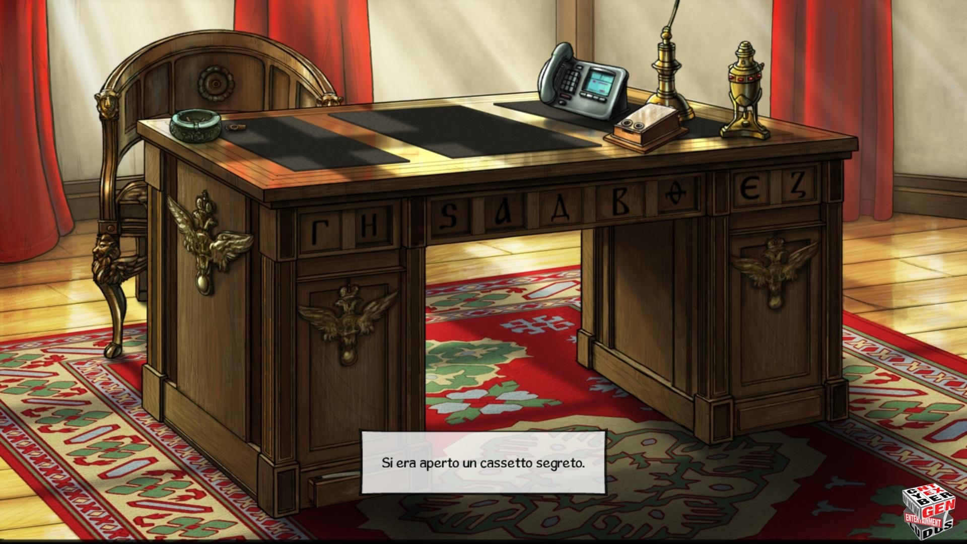 Parla con il sacerdote per farlo allontanare e perquisisci il corpo esanime di Henry. Sotto la mano c’è un bigliettino che puoi leggere: è un appuntamento per le 14:30, proprio l’ora in cui è avvenuto il fattaccio. In una tasca ha anche un profumo molto potente che puoi prendere. Prova a parlare con Laine, sposta la giacca sulla parte sinistra e prendi il tronchesino. Interagisci con il cartone della pizza per prenderne un pezzo. Interagisci con l’allarme del quadro rubato, prova il pulsante, poi apri la scatoletta ed osserva il cavo tagliato per ottenere l’achievement Chi sarà stato?. Prova ad entrare nella stanza privata, quindi parla ancora col sacerdote ed esci. Dirigiti alla tua sinistra e parla con il cameriere per chiedergli qualche informazione. Otterrai il conto che gli deve Laine. Torna dentro e usa il profumo con Laine, quindi interagisci più volte con lui per parlare dell’accaduto, ma prima gli dovrai dare il trancio di pizza. Per ottenere il codice della porta dovrai pressarlo abbastanza: in particolare, gli dovrai dar conto del filo, dei movimenti, del tronchesino e del debito verso il cameriere.