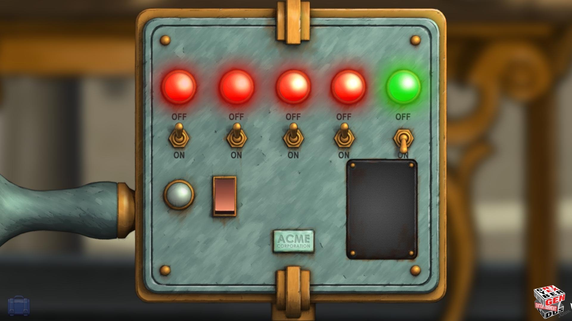 Dirigiti alla galleria: devi parlare con Laine per i documenti di proprietà del dipinto. Troverai anche l’Ispettore Navet sul luogo del delitto. Dopo il dialogo lascerai Navet e Moue alle prese con la macchina, quindi potrai interrogare tranquillamente Laine: il dialogo non durerà molto, e dovrai seguire una nuova pista, quella di Bijou. Sfortunatamente non potrai abbandonare la scena del crimine finchè Navet non ricostruirà la scena del crimine. Parla con Navet, stacca la spina della macchina (segui il cavo) e inizia a smanettare con la macchina: è un classico enigma in cui un interruttore ne controlla un altro e viceversa. Il passo intermedio è quello a lato.
