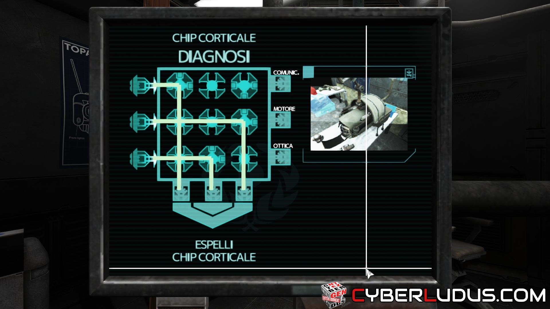 Voltati ed entra nella Clean Room. Dai uno sguardo nella stanza, poi prova ad aprire la vetrata del gel strutturale ma il chip andrà in fumo. Apri il portellino in basso, recupera il circuito integrato ed osserva la sala a destra con le 3 celle. Sblocca quella centrale, tira fuori il vassoio e poggia il chip, poi richiudi il vassoio, blocca nuovamente la cella ed utilizza i comandi vicino al monitor per impiantare del WAU sul circuito. Puoi fare la stessa cosa anche col topo morto, per notarne gli effetti. Prendi la scheda riparata e rimettila nel pannello della vetrata. Ottenuto il gel, torna indietro e stavolta entra in Laboratory e poi in Hydroponics per leggere ed ascoltare qualcosa di interessante. Quando hai fatto, prendi la South Stairwell per salire al secondo piano. Entra in Containment F2 e disattiva l’isolamento, poi vai per la Power Room. Qui incontrerai un nuovo mostro, che “si attiva” ogni volta che cammini. Infatti, questa creatura passa tutto il tempo a piangere ma per smettere ad ogni tuo passo. Più sono i passi, più comincia ad alzare lo sguardo e, quando si arrabbia, è impossibile sfuggirle. Prosegui per tutta la sala fino a trovare la batteria e poi torna indietro. L’ultima cosa da recuperare è il chip corticale. Scendi all’ultimo piano della struttura, disabilita l’isolamento e procedi per l’unica porta disponibile. Da qui, entra in Robot Repair Bay ed interagisci col piccolo monitor. Per espellere il chip corticale posiziona gli elementi in questo modo: