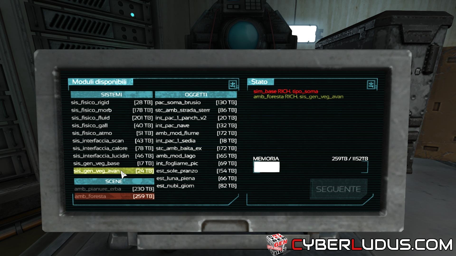Poi inizia a selezionare le voci richieste e, quando c’è una doppia scelta, devi attivare quelle che nel complesso occupano meno spazio. In particolare, la risorsa sis_fisico_fluid è sfruttata da due componenti (amb_mob_fiume e est_luna_piena) e quindi consente di risparmiare una risorsa in più (ovvero sis_fisico_morb che è richiesta con amb_mob_lago).