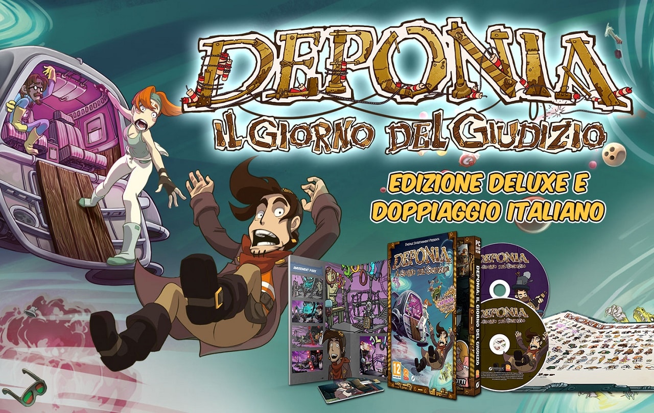 Dopo aver realizzato con successo la campagna di crowdfunding per il doppiaggio italiano di Addio Deponia, grazie al sostegno di oltre 500 backers italiani, e dopo aver portato sugli scaffali di tutta Italia il terzo capitolo dell’acclamata saga targata Daedalic Entertainment, oggi il distributore Adventure Productions lancia sulla piattaforma italiana Eppela.com una nuova campagna dedicata a Rufus e Gal! Stiamo parlando del progetto dedicato a Deponia: Il Giorno del Giudizio (in origine Deponia: Doomsday), quarto e ultimo capitolo della serie, uscito in versione multilingua (priva di italiano) ormai due mesi fa su Steam. Questa nuova campagna ha un duplice obiettivo: il primo, fissato a 5mila euro, legato alla realizzazione di una edizione deluxe destinata ai backers e agli scaffali dei negozi italiani; il secondo, fissato a 20mila euro, consentirà di realizzare il doppiaggio in lingua italiana con la collaborazione di JingleBell Communication, studio già responsabile delle voci dei precedenti capitoli.