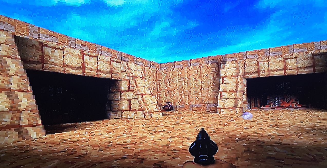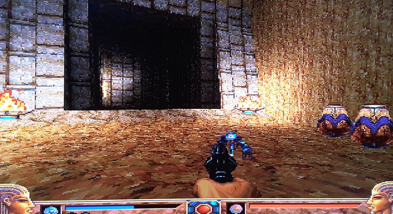 Exhumed, grazie al motore grafico studiato appositamente per console, vantava su PlayStation (la versione giocata e “vissuta” dal sottoscritto) un profilo tecnico di altissimo livello. Correre tra stretti corridoi illuminati solo dalle fiaccole o fermarsi ad ammirare le antiche città dell’Antico Egitto, sotto il cocente sole del deserto, era un vero piacere per gli occhi. Quelli che oggi vediamo come un ammasso di grossi pixel e goffe figure bidimensionali, a malapena animate, erano nel 1996 quanto di meglio si potesse chiedere a una console. La fluidità delle immagini era all’epoca da ritenere semplicemente eccezionale.