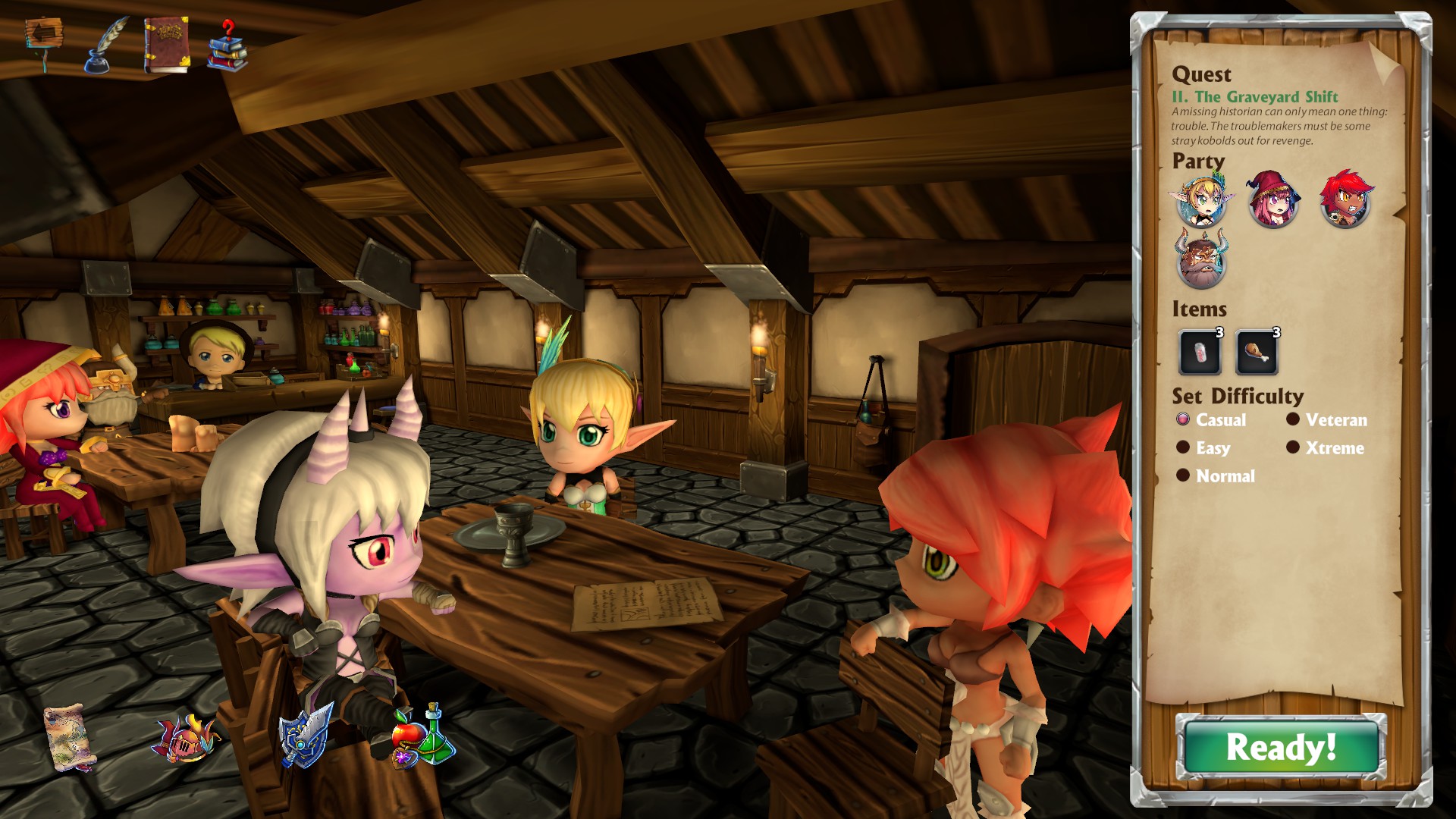 Super Dungeon Tactics si mostra fin dalle prime battute di gioco scarno e con un menù davvero minimale. Nello specifico, la schermata principale nella quale potremo decidere ogni dettaglio su missioni, personaggi e inventario si presenta molto colorata, ma poco chiara.