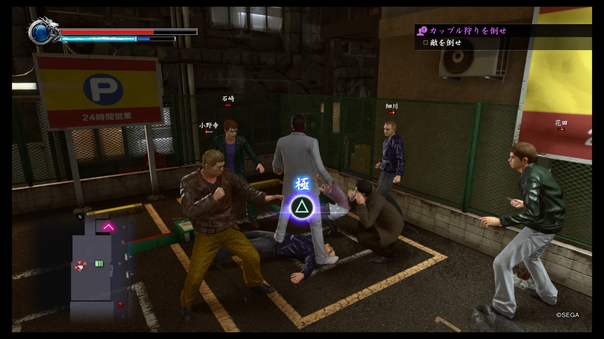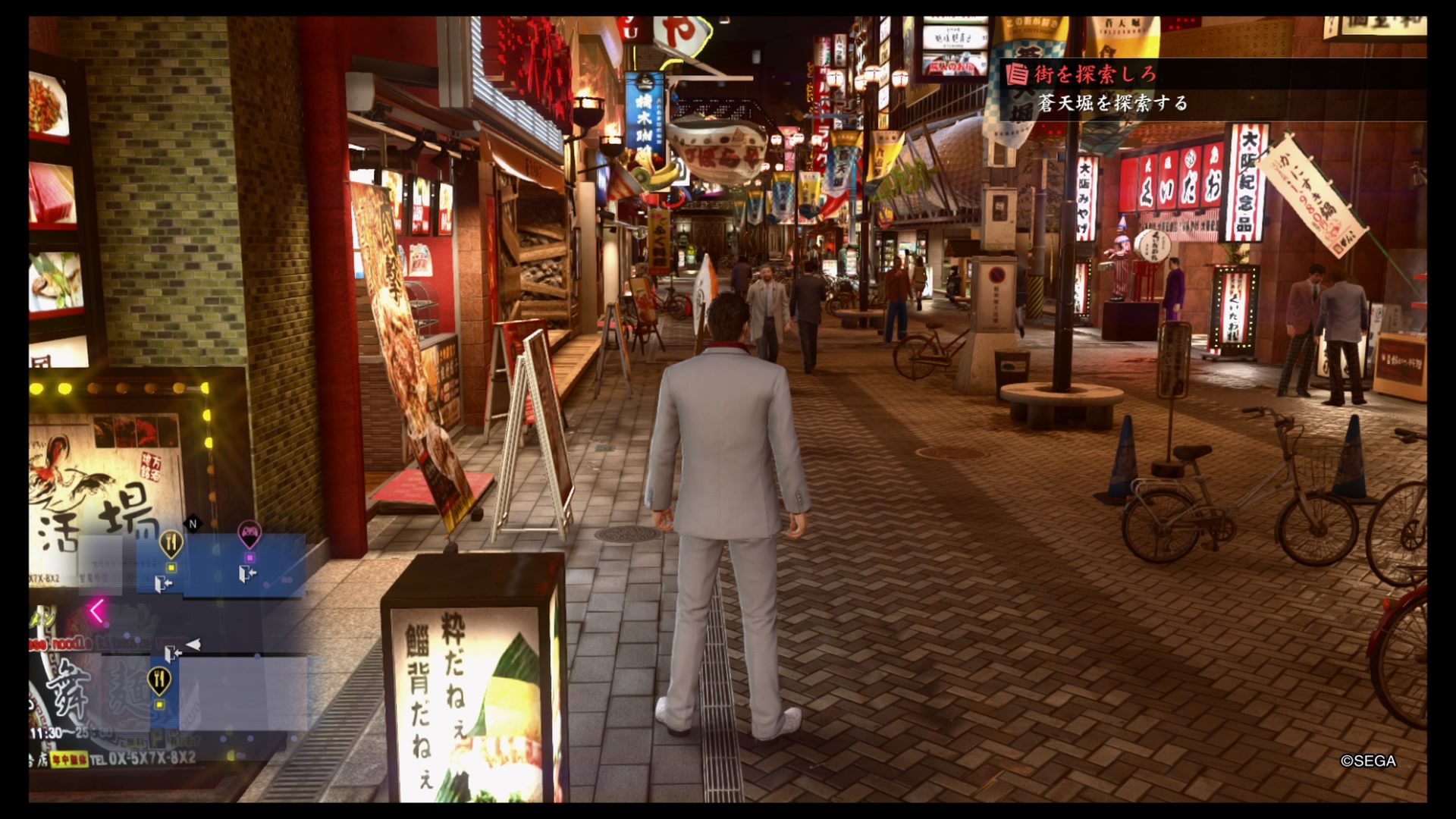 Una volta liberi di esplorare ci si aprirà letteralmente un mondo. Essendo questa demo ritagliata dalla parte iniziale del gioco, saranno in realtà poche le attività secondarie alle quali potersi dedicare ma non mancheranno di lasciarci ben intendere quale sarà l’offerta che ci attenderà nel gioco completo. In modo simile a quando giravamo per Kamurocho, il cuore di Sotenbori si schiude di notte, quando le mille luci dei tanti locali e localini brillano in contrasto con il cielo nero. Quando le strade si riempiono di lavoratori appena usciti dai tanti uffici e gli avventori più audaci iniziano a fare il filo alle ragazze degli hostess club. Mentre si passeggia, notiamo una ragazza vestita in latex e con una mascherina, è circondata da loschi individui, meglio controllare cosa sta succedendo. Vista la nostra limitata conoscenza del giapponese, il dialogo resterà in parte incomprensibile ma ciò che è assolutamente chiaro è che la pulzella ha bisogno del nostro aiuto. Calci, pugni e prese hanno la meglio sul gruppetto che si defila lasciandoci incolumi alla mercé dei ringraziamenti della ragazza. Anche oggi abbiamo fatto il nostro dovere. A questo punto ci fermiamo a un chiosco di takoyaki e decidiamo di ricompensarci con una bella porzione da mangiare per strada mentre ci avviamo alla ricerca di qualche svago. Ecco che compare un negozietto che vende video osé che non possiamo non visitare. All’interno sventolano poster di belle ragazze ammiccanti e sono presenti scaffali con vari video, vicino al bancone c’è una porta che conduce sicuramente a prodotti molto più spinti ma l’accesso ci è negato e ci accontentiamo dei film che abbiamo sotto mano. Per chiudere la serata andiamo a fare due tiri a freccette ma una esperta giocatrice ci riduce al verde e questo punto è meglio tornare a casa. Sotenbori si rivela essere come un novello Virgilio che ci conduce mano nella mano in quel meandro di contraddizioni, sesso, divertimento e violenza che è il Giappone moderno, un viaggio che speriamo di poter riprendere al più presto.