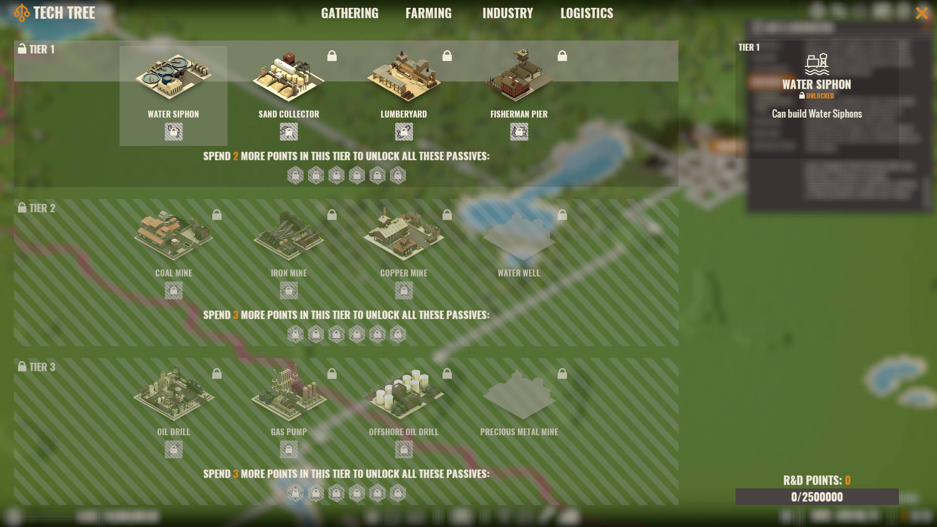 Nonostante le linee guida, una volta tuffati nella mischia della carriera ufficiale ci si ritrova un po’ spaesati – alcuni aspetti del gioco non sono ben spiegati (come la scelta della città e del terreno) e soprattutto risulta arduo intuire come cominciare su un ramo produttivo differente da quello esposto nel tutorial. Dovete sapere infatti che alla partenza tutte le costruzioni sono inaccessibili e per accedervi occorrerà spendere dei punti R&D (ricerca e sviluppo ndr) nelle 4 categorie primarie (coltivazione, industria, raccolta e logistica) – ve ne vengono da subito forniti 5 per sbloccare alcune tecnologie ed iniziare a costruire. Punti aggiuntivi si ottengono raggiungendo determinati obiettivi sulla base del vostro operato: per il ramo coltivazione, ad esempio, dovete generare prodotti agricoli, per l’industria produrre beni e così via).