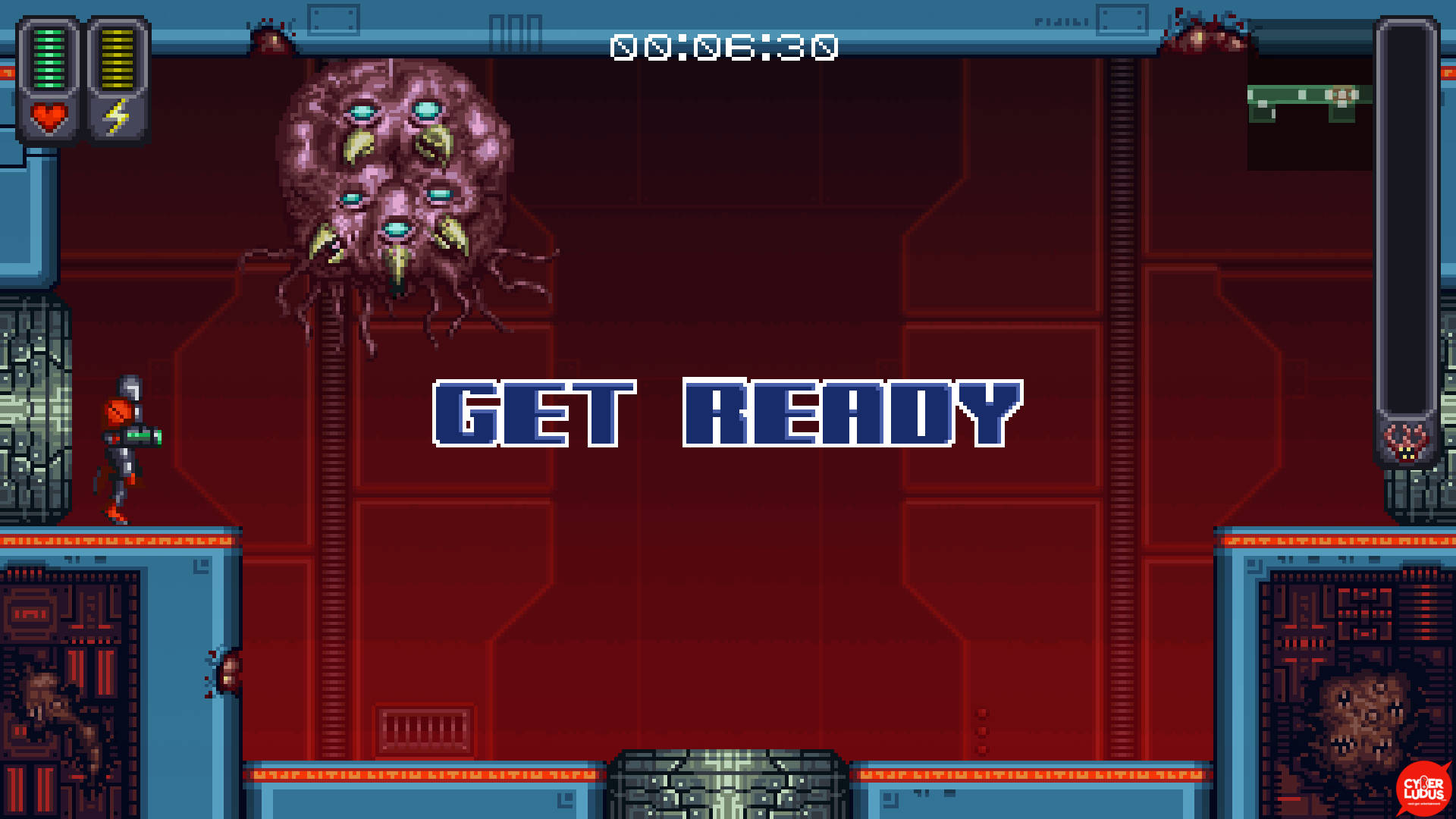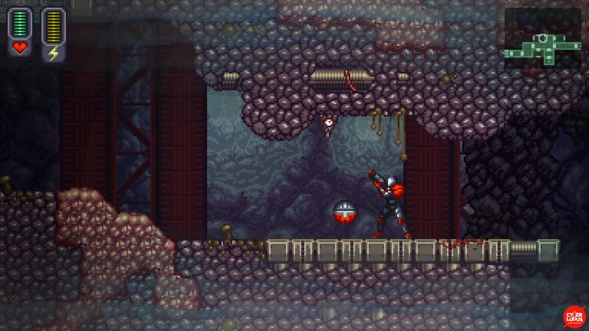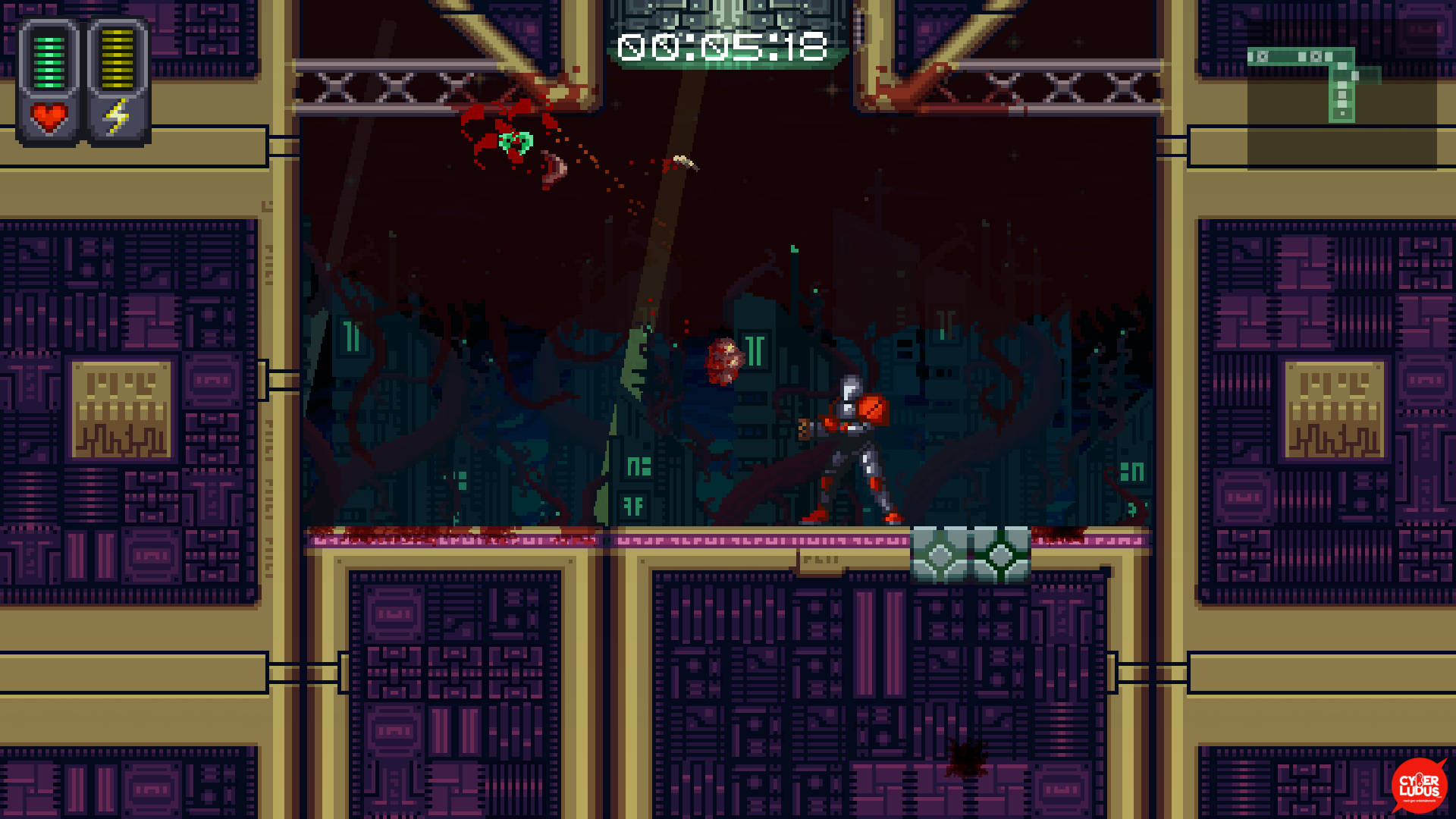 A Robot Named Fight è stato sviluppato interamente con il sempre più stimato Unity. La grafica, l’audio, i menu, tutto è stato disegnato per ricalcare fedelmente un gioco anni ‘90, e dobbiamo dire che l’intento è davvero riuscito – a parte gli effetti grafici di sangue e membra che volteggiano per lo schermo ed imbrattano i muri sembra davvero di giocare ad un emulatore del Super Nintendo – l’unico appunto che possiamo fare è che in certi biomi si fatica a distinguere le superfici calpestabili dal resto.