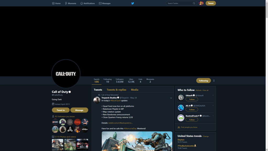 La foto del profilo presenta un logo CALL OF DUTY appena stilizzato, come da tradizione, su sfondo totalmente nero. La bio recita “Going Dark”.