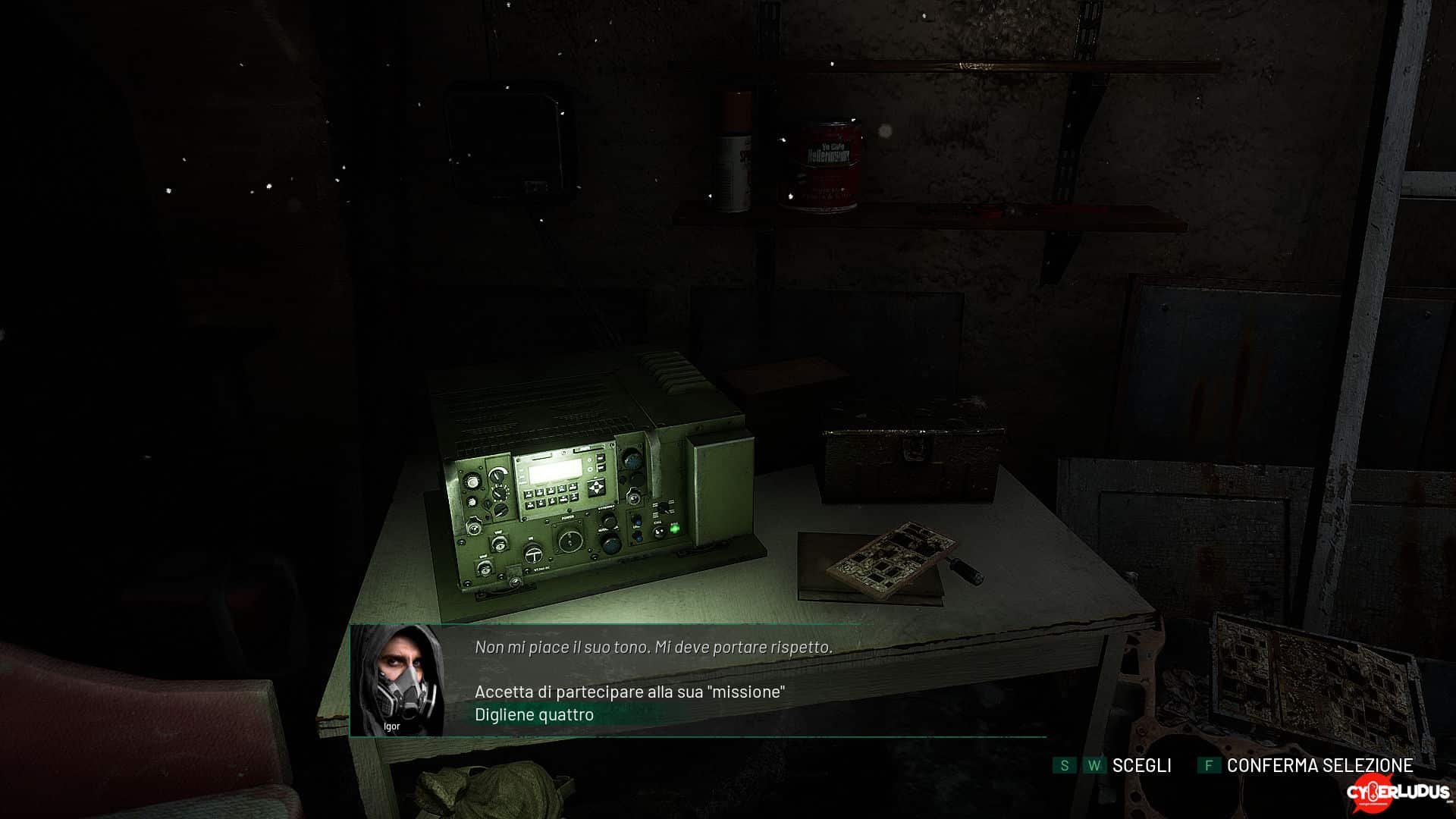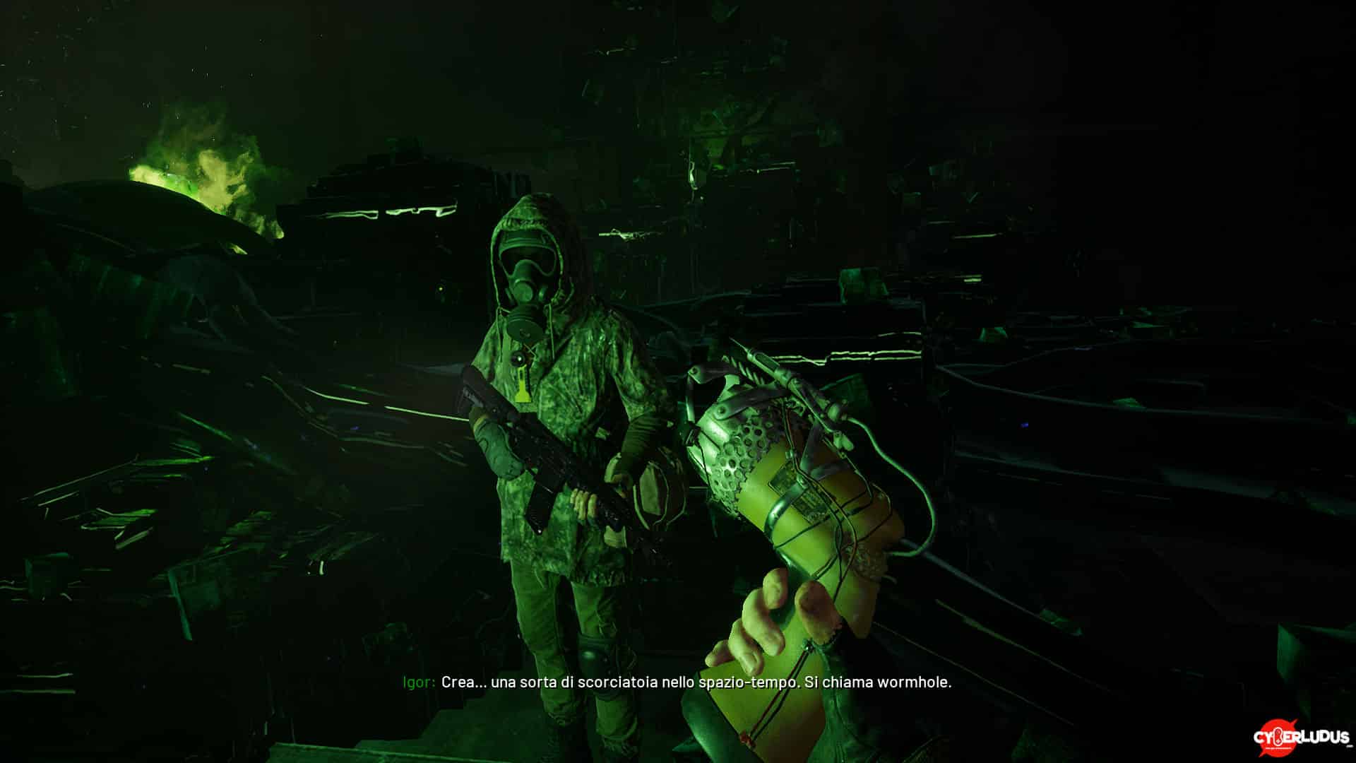 La trama di Chernobylite viene dichiarata come non lineare dai suoi creatori e dobbiamo dire che, in questo senso, i nostri amici polacchi hanno messo insieme un sistema davvero interessante. Durante le missioni principali capita spesso, infatti, che il giocatore si ritrovi davanti ad una scelta dove solitamente è coinvolto uno dei compagni NPC, che offre consigli più o meno etici sul da farsi. Dobbiamo uccidere il prigioniero o lasciarlo andare? Distruggere le prove oppure conservarle per studiarle? Salvare l’ostaggio o lasciarlo al suo destino? Ebbene, queste scelte cambiano alcuni aspetti della storia, talvolta anche in maniera abbastanza profonda, ma, fin qui, niente di nuovo … dopotutto non si tratta certo del primo titolo che offre questo tipo di tessitura interattiva della trama, basti pensare al recente Cyberpunk. La novità arriva quando il giocatore, volontariamente o no, perde la vita ed interviene il magico potere del minerale verde fosforescente… Il game over infatti in Chernobylite causa il trasporto del protagonista in una dimensione dove il tempo e lo spazio si fondono – un lungo corridoio evanescente dove tramite dei cristalli si manifestano tutte le scelte prese. Interagendo con essi è possibile modificare queste scelte, per cambiare l’esito di una decisione presa e di tutte le ripercussioni che essa ha avuto – questo meccanismo ci è venuto incontro più di una volta quando magari, dopo ore di gioco, abbiamo scoperto che il personaggio lasciato morire giorni prima ci aveva precluso una parte di storia. Questa azione ha comunque un costo – ogni azione di modifica del passato costa tre cristalli di Chernobylite che non sono facili da reperire! Inoltre, se l’evento modificato ha ripercussioni su altri eventi, ognuno andrà conseguentemente modificato e la somma totale di cristalli potrebbe diventare molto alta… Tutto sommato è un’idea davvero interessante, gradevole, che rende anche meno stressante l’esperienza di gioco, ma che allo stesso tempo ne riduce la rigiocabilità.