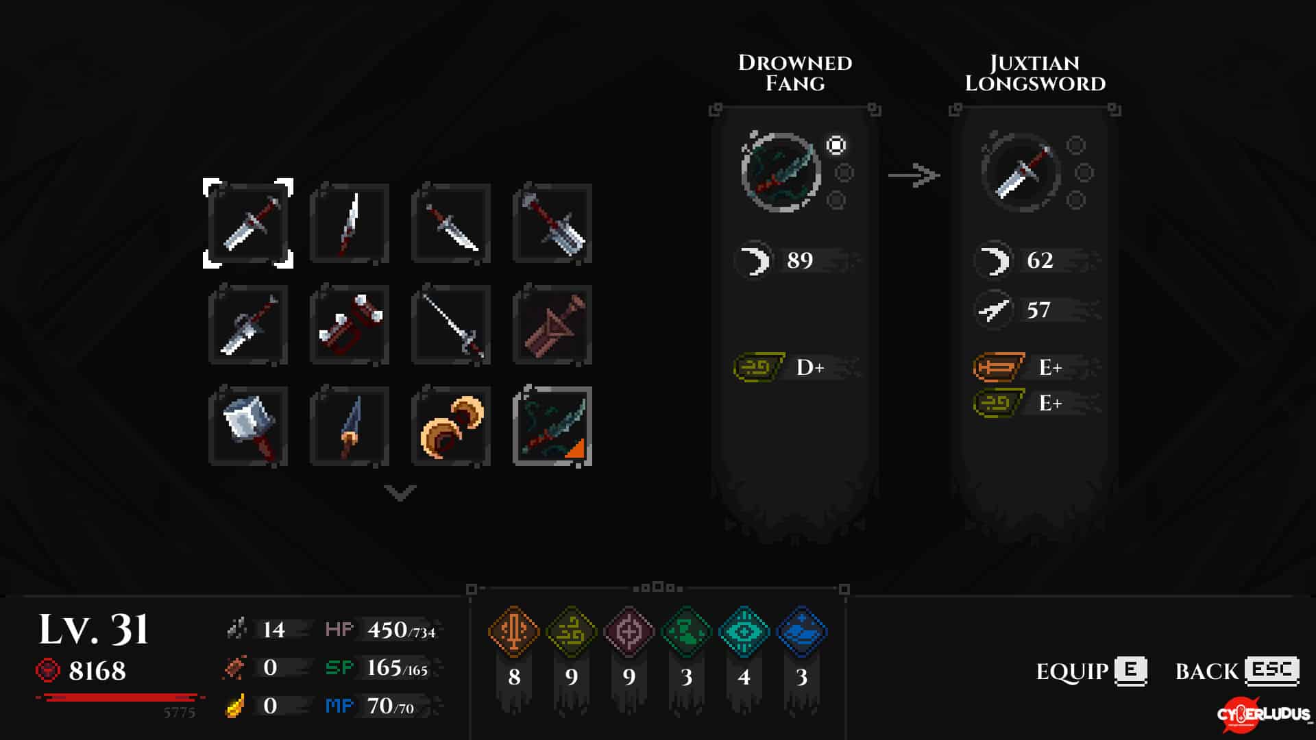Niente Unity stavolta – Tarnishing Of Juxtia è interamente sviluppato con GameMaker Studio 2. La qualità della pixel graphic è decisamente buona, molto pulita. Gli scenari sono caratteristici, ben rifiniti e mai noiosi, mentre i personaggi sono ricchi di dettagli, nonostante i limiti dello stile adottato. I Boss sono spesso spettacolari, molto ben realizzati e vari. Le animazioni di ogni essere risultano per gran parte efficaci, anche se a volte poco naturali dove si avverte l’effetto “marionetta”, ma non troppo rimarcato come in altri titoli 2D simili.