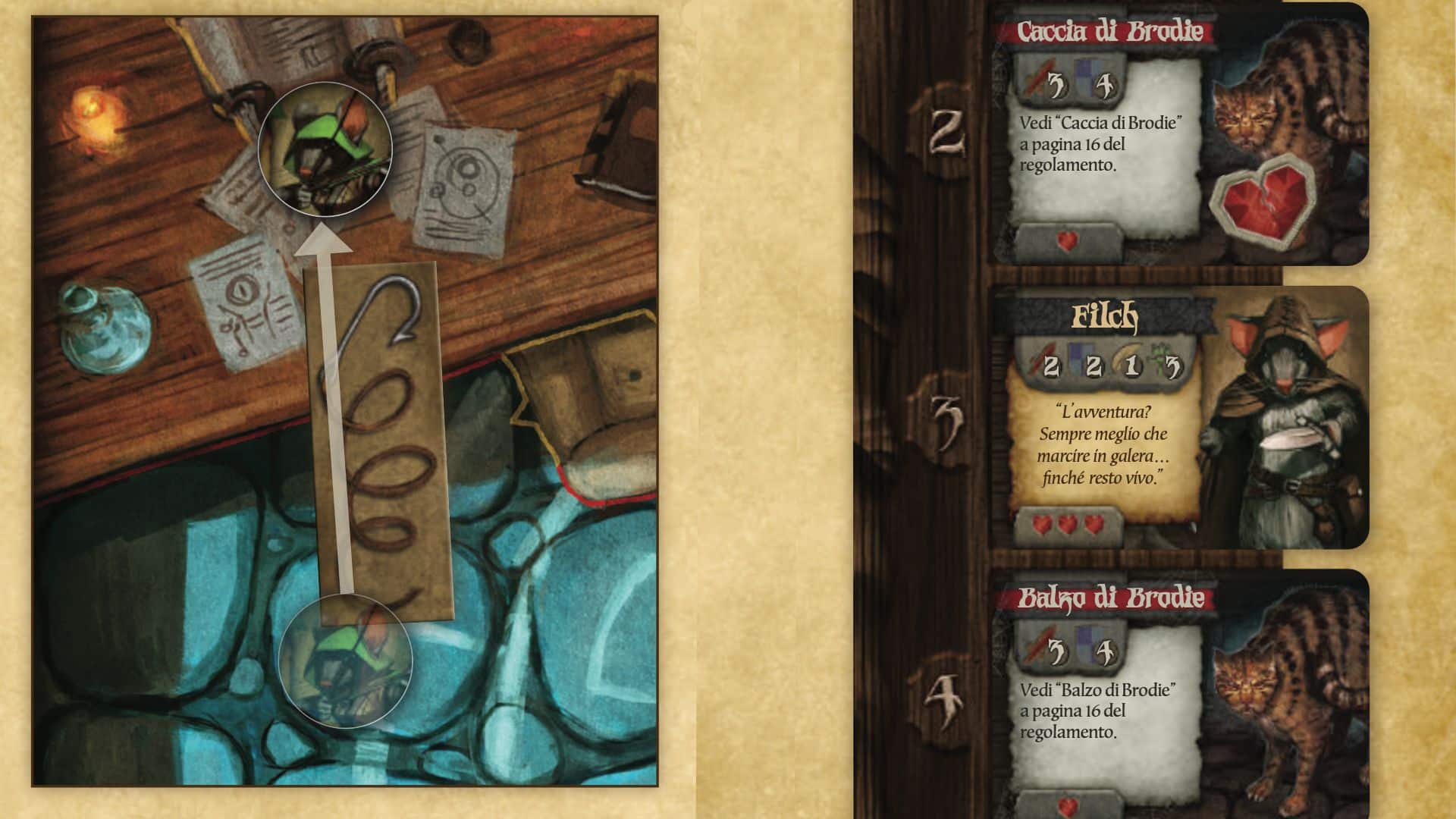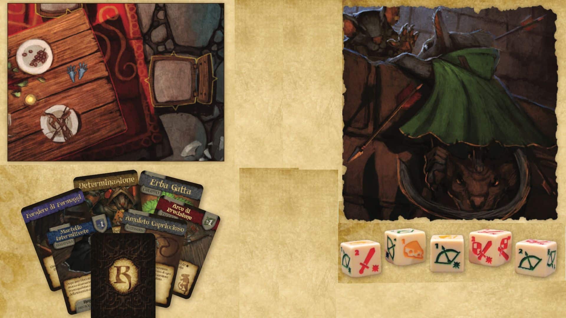 E qui il gioco colpisce forte. Le miniature sono splendide, dettagliate al punto giusto, e le tessere mappa sono veri piccoli quadri che ricreano cucine, cantine e prigioni viste dalla prospettiva di un topo. Aprire la scatola è come tuffarsi dentro un libro illustrato: ogni pezzo sembra gridare “giocami!”, e la lettura delle introduzioni in stile favola fa davvero pensare di avere tra le mani un’esperienza unica, qualcosa che unisce il racconto alla partita.