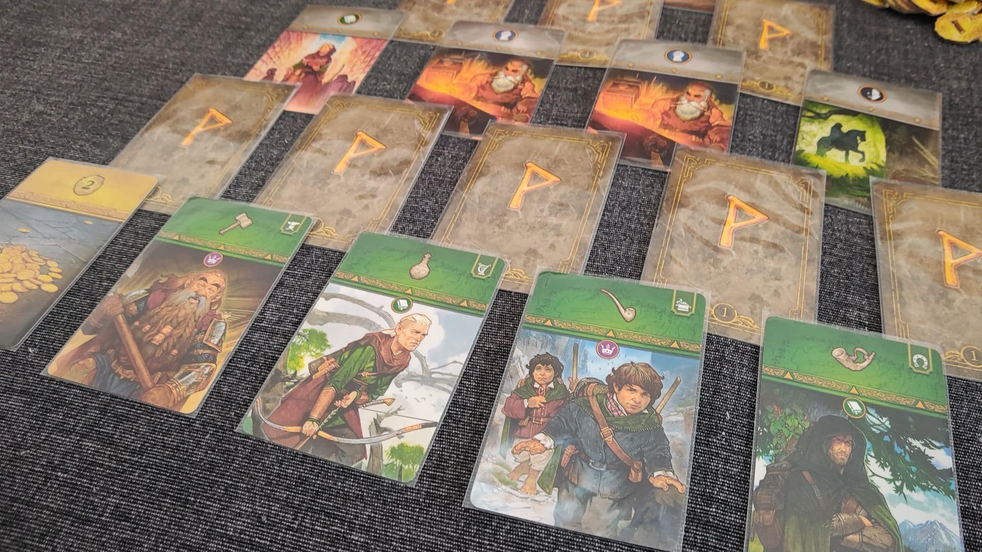 La struttura a tre capitoli e il drafting di carte “scoperte/parzialmente coperte” sono immediatamente familiari a chi conosce 7 Wonders: Duel, ma qui le somiglianze finiscono presto. Le carte mantengono colori e ruoli — abilità (grigie), monete (gialle), Razze (verdi), anelli (blu), movimento/conflitto (rosse) e carte speciali (viola) — e introducono meccaniche specifiche come la concatenazione (play gratuito di carte con simbolo corrispondente) e il pagamento di 1 moneta per ogni simbolo Abilità mancante per giocare una carta. Anche lo scarto rimane una scelta tattica: scartare porta monete in base al capitolo corrente (1/2/3).