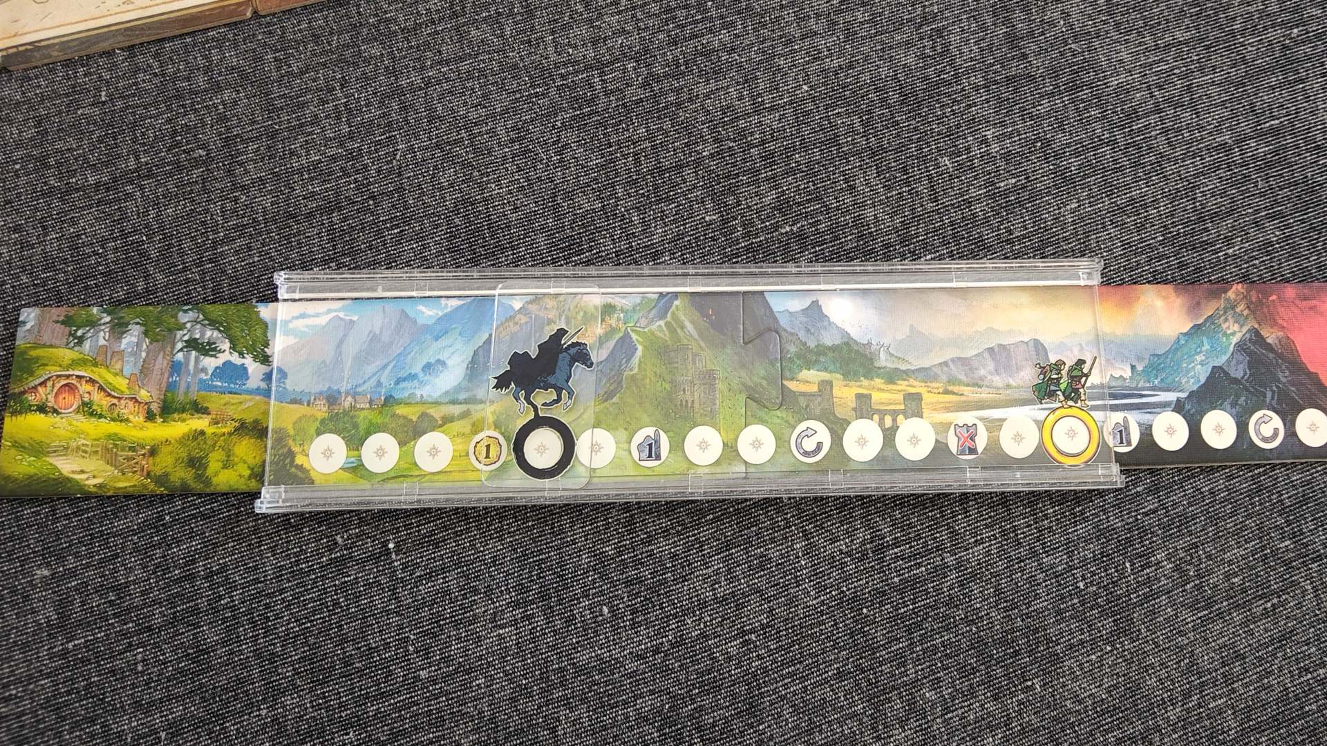 - Tracciato dell’Impresa dell’Anello: sostituisce la semplice escalation militare con una corsa narrativamente più pregnante. Frodo e Sam si muovono verso il Monte Fato mentre i Nazgûl inseguono il portatore dell’anello – il distanziamento è un elemento meccanico concreto — quando il Nazgûl si avvicina la pressione sul giocatore Compagnia aumenta, e raggiungere o superare caselle bonus dà effetti immediati. Questo tracciato può generare vittorie istantanee e fa salire la tensione in modo netto.