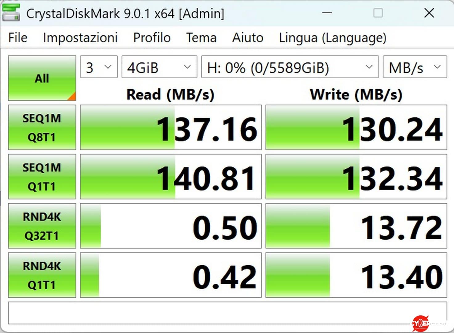 Sul fronte tecnico ho analizzato le prestazioni tramite software come CrystalDiskMark. I risultati sono stati perfettamente in linea con quanto dichiarato dal produttore: velocità di lettura sequenziale nell’ordine dei 130/140 MB/s, valori assolutamente coerenti con un HDD esterno collegato tramite USB 3.2 Gen 1.