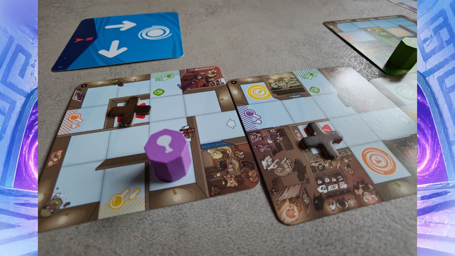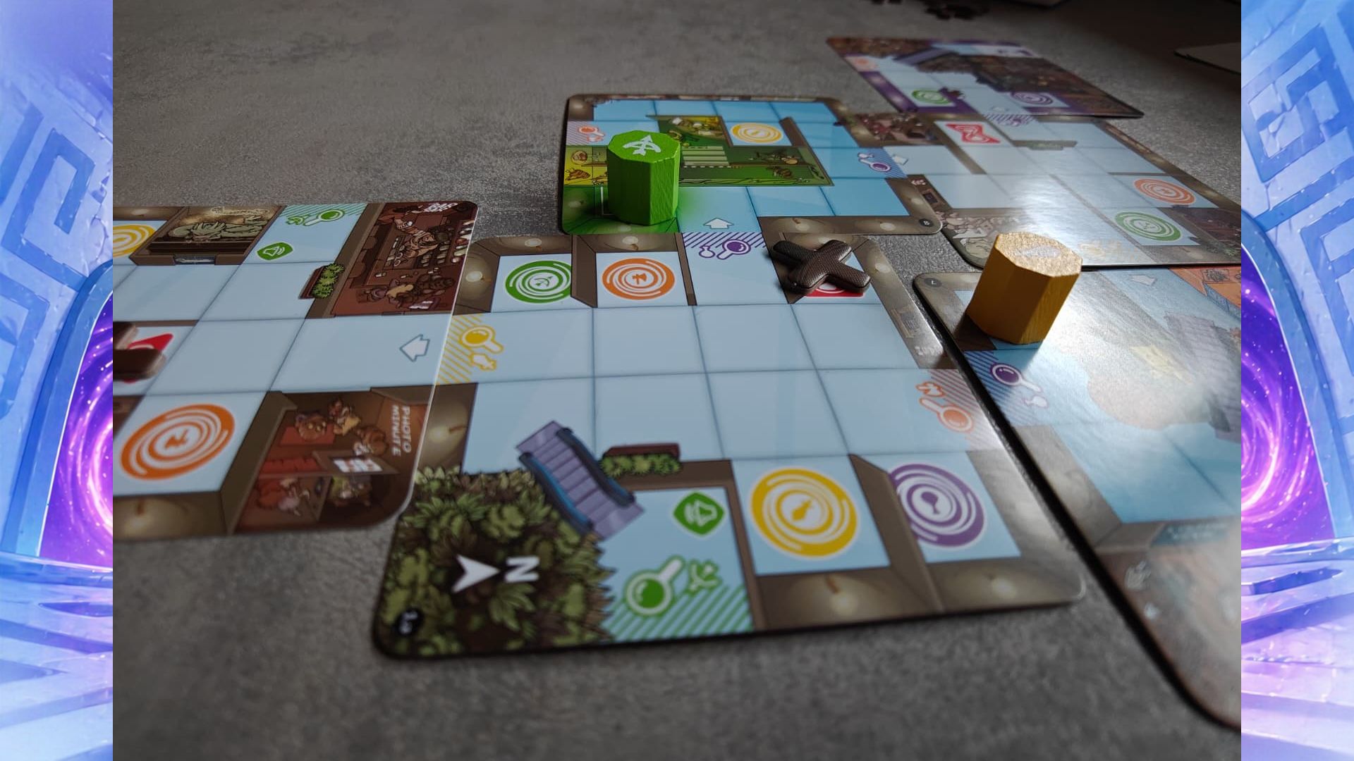 Magic Maze Pocket è un cooperativo in tempo reale, senza turni, in cui tutti i partecipanti devono riuscire a guidare i quattro eroi all’interno del centro commerciale, rubare gli oggetti designati e poi fuggire prima che il timer virtuale scada. La particolarità è che ogni giocatore ha accesso solo a azioni specifiche indicate dalla propria carta, quindi non controlla liberamente i personaggi, ma può intervenire soltanto quando la sua abilità è utile. Questo trasforma ogni partita in una sorta di collaborazione frammentata, fatta di intuizioni rapide, incastri e una comunicazione volutamente limitata.